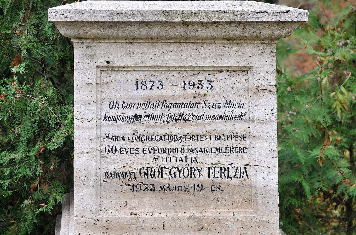 Templom - külső látnivalókImmaculata (Szeplőtlen Szűzanya) talapzatának felirata -